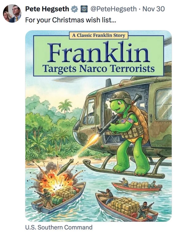 Esto nos lleva al tercer precedente peligroso que se está sentando: ligado a esto hay una celebración sanguinaria de la matanza. Ante toda esta controversia, Hegseth publicó una imagen de Franklin la Tortuga (un personaje animado para niños en edad preescolar) disparando alegremente a hombres en barcos. La portavoz de MAGA, Megyn Kelly, dijo en su programa de SiriusXM que “realmente no solo quiero verlos asesinados en el agua… Me gustaría mucho verlos sufrir. Me gustaría que Trump y Hegseth hicieran que durara mucho tiempo para que perdieran una extremidad y se desangraran un poco”.