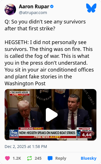 HEGSETH: Yo personalmente no vi a ningún superviviente. El lugar estaba en llamas. A esto se le llama la niebla de la guerra. Esto es lo que ustedes, los periodistas, no entienden. Se sientan en sus oficinas con aire acondicionado y publican noticias falsas en el Washington Post.