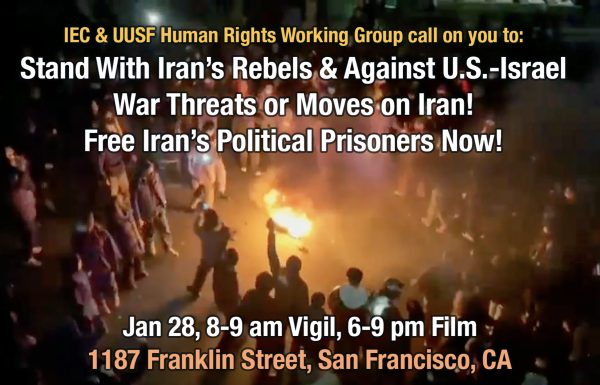 - La mañana del miércoles 28 de enero, en las calles Franklin y Geary en San Francisco de 8 a 9 de la mañana la vigilia semanal de los UUSF. Traer carteles y pancartas que expresen solidaridad con los presos y manifestantes en Irán, y oposición a las amenazas de guerra de parte de Israel y Estados Unidos.
