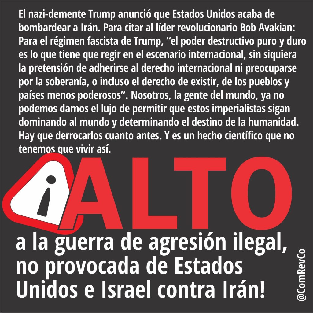 Campaña Internacional de Emergencia para Liberar a los Prisioneros Políticos en Irán Ahora (CIE) A luchar para la solidaridad con los presos en Irán en peligro grave en medio de informes de masacres de manifestantes Revcom.us La República Islámica de Irán masacra a miles de personas que se ponen de pie justamente. Ya no es hora de elegir entre opresores Revcom.us El pueblo iraní se levanta contra la odiada República Islámica El fascista Trump amenaza con intervención militar PCI(mlm) ¿La guerra causa bajas? Revcom.us Me quedan 15 años para llegar a los 100… pero Trump tiene que largarse ya Una nota de C. Clark Kissinger, con motivo de su 85 cumpleaños Grupo Comunista Revolucionario, Colombia ¡FUERA ESTADOS UNIDOS DE VENEZUELA! ¡LOS IMPERIALISTAS NO SON LA SOLUCIÓN, SON EL PROBLEMA! enero 3, 2026 Grupo Comunista Revolucionario, Colombia ¡No a una guerra imperialista estadounidense contra Venezuela! ¡No a la dominación imperialista sobre América Latina y el mundo! diciembre 9, 2025 Venezuela: lo mucho que está en juego para el mundo… y el desafío para ustedes Revcom.us Trump declara el control total de Venezuela Hay que atajar a este gánster imperialista fascista Revcom.us URGENTE: ¡LOS IMPERIALISTAS ESTADOUNIDENSES INVADEN CRIMINALMENTE VENEZUELA Y SECUESTRAN A MADURO! Revcom.us Venezuela: Las flagrantes mentiras de Stephen Miller — y la profunda verdad que esas mentiras no pueden ocultar Revcom.us comrev.co noviembre 2, 2025 El FASCISMO no es una amenaza que se avecina. Lo tenemos encima … YA. Revcom.us noviembre 2, 2025 De Revcom.us: Editorial: 5 de noviembre: ¡A lanzar un levantamiento no violento sostenido de miles de personas, que crezca a millones, para expulsar del poder al régimen fascista de Trump Organización Comunista Revolucionaria, México septiembre 23, 2025 ¡Luchar ahora para la nueva revolución socialista! PCI(mlm) junio 22, 2025 El imperialismo estadounidense invade Irán y comete un crimen nuclear. En respuesta, ¡Levantar en todo el mundo la bandera de la emancipación de la Humanidad! PCI(mlm) junio 15, 2025 ¡Debemos oponernos a la crueldad fascista de Israel y del imperialismo estadounidense! comrev.co junio 9, 2025 Sobre el atentado contra el precandidato presidencial Miguel Uribe Turbay Page1 Page2 Page3 Page4 Page5 … Page20 Lea los mensajes mediáticos de @BobAvakianOfficial Obras esenciales de Bob Avakian Entrevistas a Bob Avakian 2025 (en inglés)